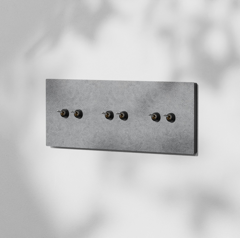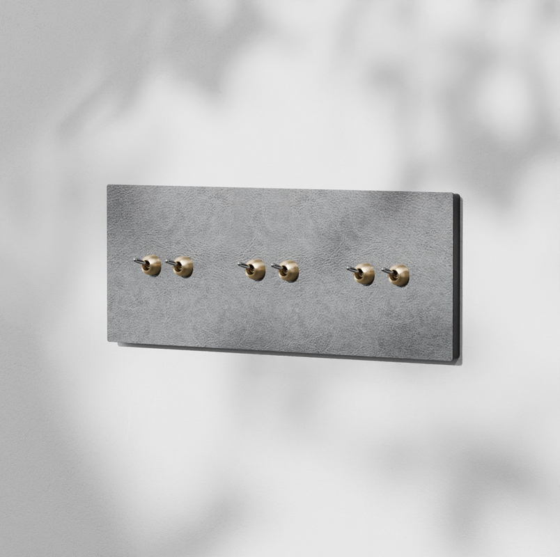 Este modelo presenta una placa con un acabado de efecto cuero que sorprende por su realismo gracias a la superficie suave y mate de aspecto granulado. Su tonalidad neutra aporta la ventaja de adaptarse con facilidad a una amplia variedad de estilos decorativos, destacando por su versatilidad que le permite ir a juego con múltiples paletas de colores. Además, los interruptores están fabricados en acero de alta calidad y cuentan con embellecedores que puedes elegir entre acabado latón o negro texturizado.