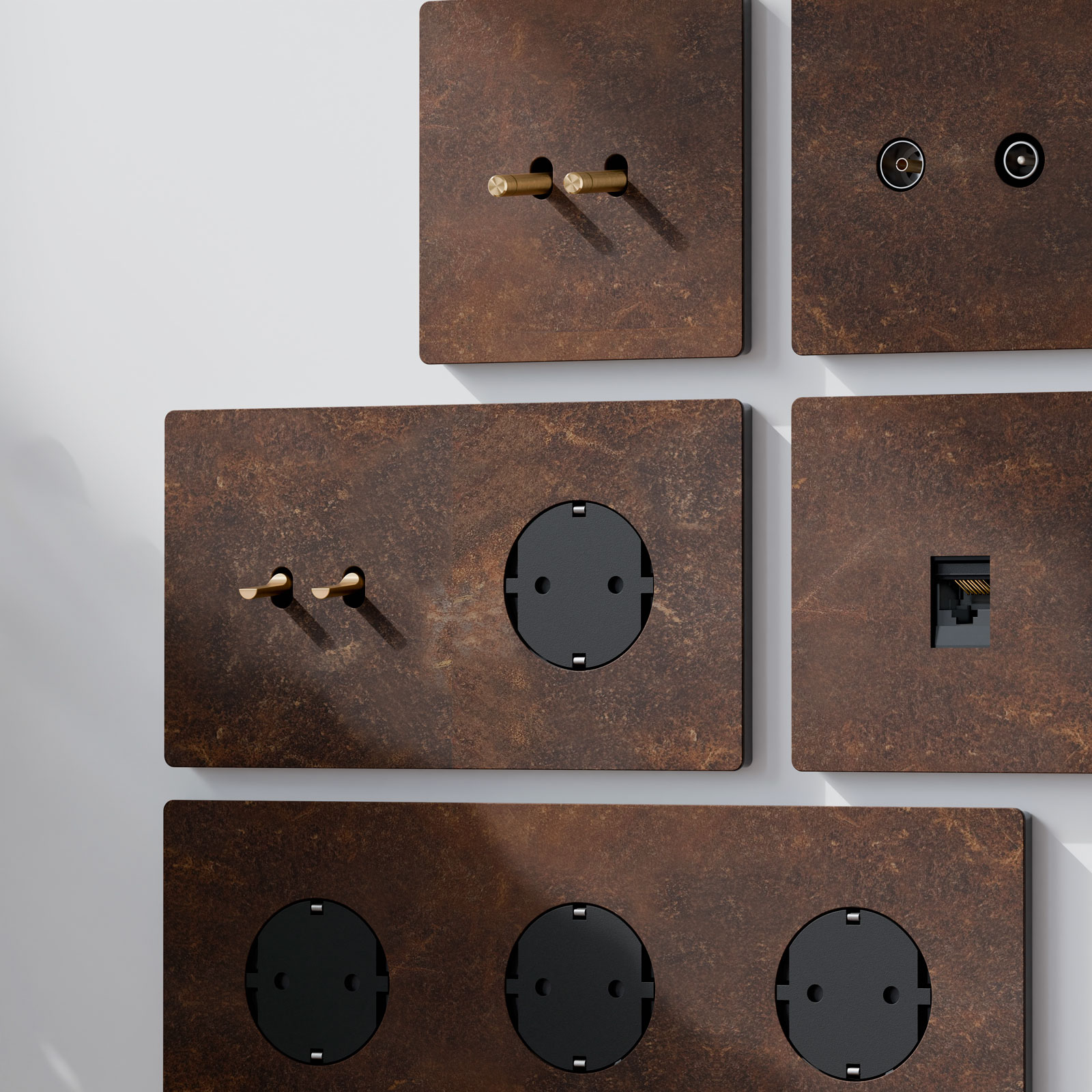 La colección Óxido presenta un acabado que imita el acero oxidado al estilo del corten, integrando un superficie suave y mate, que crea un contraste atractivo en espacios con predominancia de blancos, beiges, tonos claros y desaturados. Las placas están fabricadas en termolaminado de alta presión, un material ignífugo, fácil de limpiar, antibacteriano y resistente a la humedad. Sus interruptores y pulsadores, fabricados en metal auténtico, están disponibles con embellecedores en Aluminio, Latón y Negro texturizado.