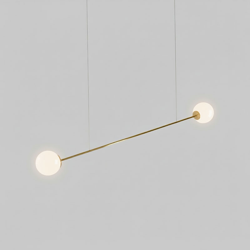 Nuestra lámpara colgante Funámbula 10, consta de 1 barra de latón de 100 cm. de longitud, rematada en sus extremos por 2 tulipas de cristal opal de 12 cm. de diámetro cada una, que incorporan casquillo G9, apto para luminarias led de mínimo consumo.