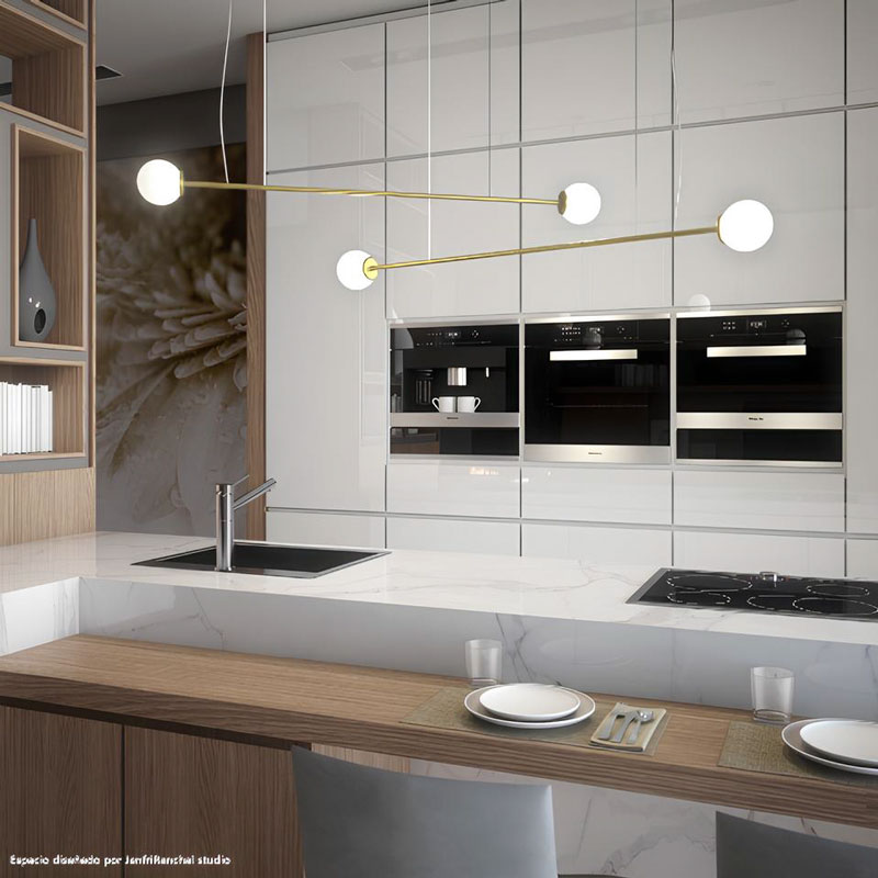 Las tulipas de cristal opal keppler de nuestra lámpara colgante Funámbula 10 funcionan con casquillo G9 apto para led de mínimo consumo.