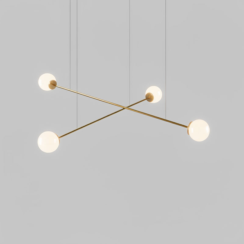 Nuestra lámpara colgante Funámbula doble, se compone de 2 barras de latón que miden 100 cm de longitud cada una. Cada barras incluye 2 tulipas de cristal translucido Keppler de 12 cm. de diámetro