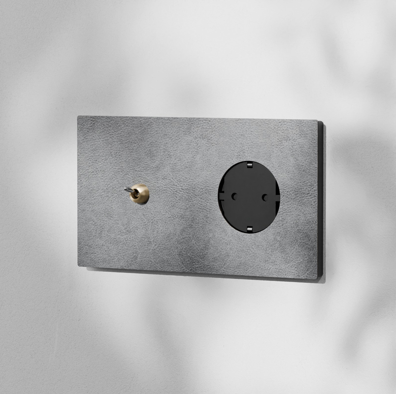 Este modelo presenta una placa con un acabado de efecto cuero que sorprende por su realismo gracias a la superficie suave y mate de aspecto granulado. Su tonalidad neutra aporta la ventaja de adaptarse con facilidad a una amplia variedad de estilos decorativos, destacando por su versatilidad que le permite ir a juego con múltiples paletas de colores. Además, el interruptor cuenta con embellecedores que puedes elegir entre acabado latón o negro texturizado.