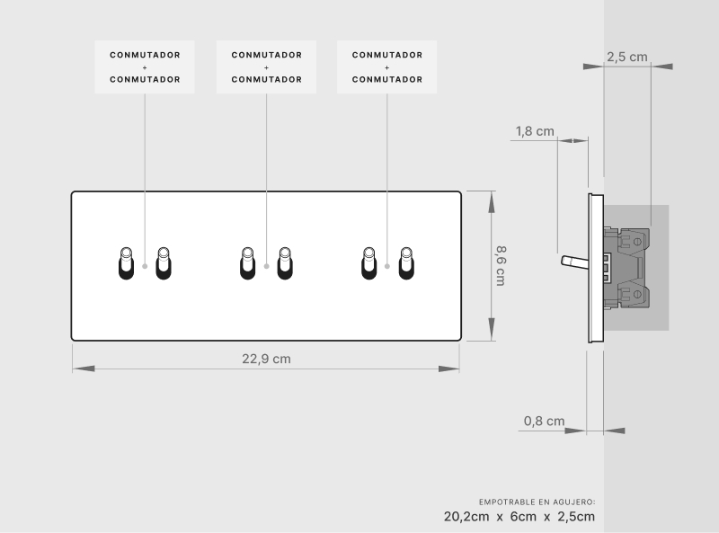 El mecanismo ofrece también la posibilidad de configurar cada palanca como interruptor conmutador, para encender y apagar una misma luz desde 2 ubicaciones.