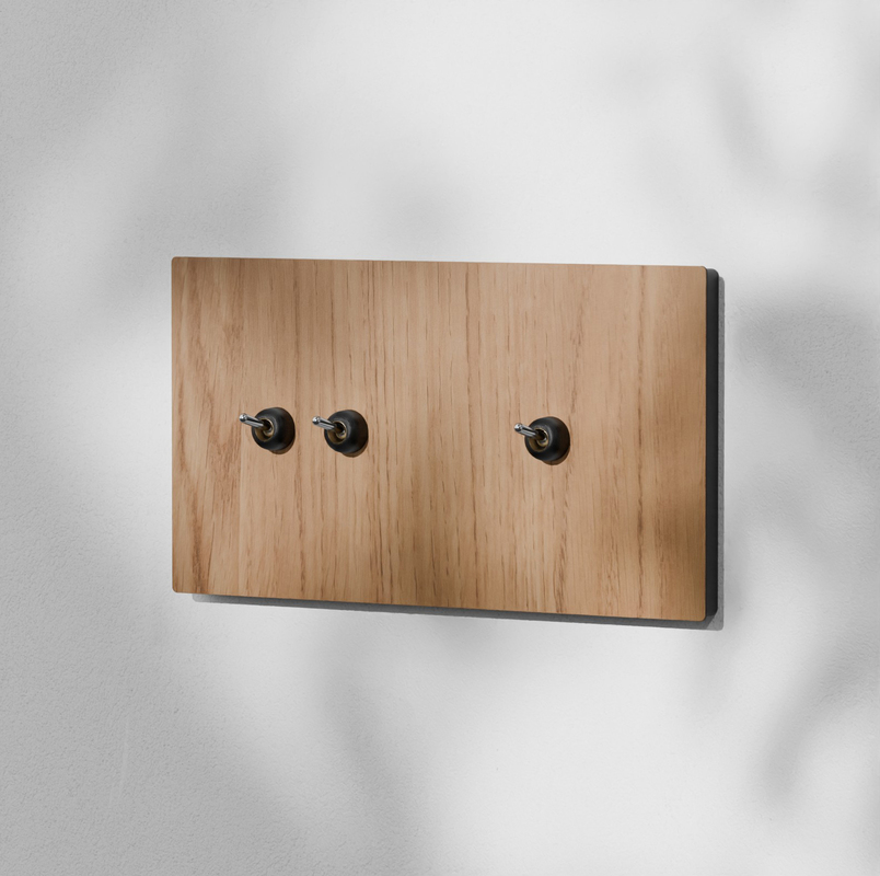 Este modelo presenta una placa con un acabado que imita la madera de roble, con una superficie suave y mate que combina tonos claros con sutiles toques de rosa y naranja. Este acabado aporta una sensación acogedora y un toque de frescura, especialmente en ambientes donde predominan los tonos blancos y desaturados. Además, los interruptores cuentan con embellecedores que puedes elegir entre acabado latón o negro texturizado.