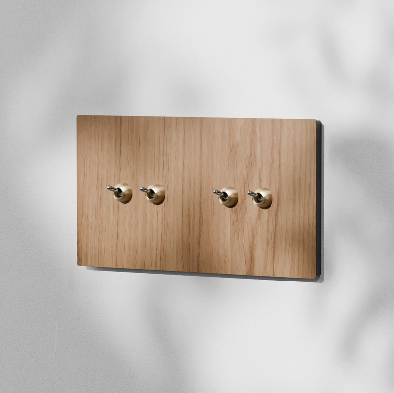 Este modelo presenta una placa con un acabado que imita la madera de roble, con una superficie suave y mate que combina tonos claros con sutiles toques de rosa y naranja. Este acabado aporta una sensación acogedora y un toque de frescura, especialmente en ambientes donde predominan los tonos blancos y desaturados. Además, los interruptores cuentan con embellecedores que puedes elegir entre acabado latón o negro texturizado.