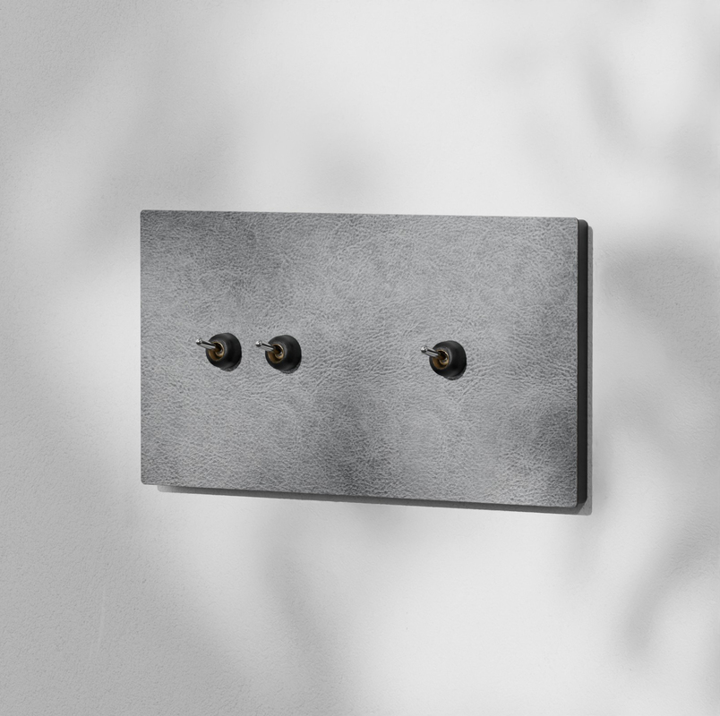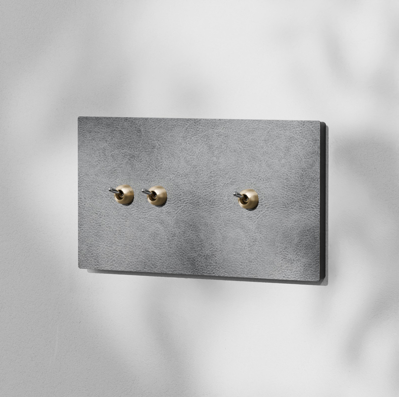 Este modelo presenta una placa con un acabado de efecto cuero que sorprende por su realismo gracias a la superficie suave y mate de aspecto granulado. Su tonalidad neutra aporta la ventaja de adaptarse con facilidad a una amplia variedad de estilos decorativos, destacando por su versatilidad que le permite ir a juego con múltiples paletas de colores. Además, los interruptores cuentan con embellecedores que puedes elegir entre acabado latón o negro texturizado.