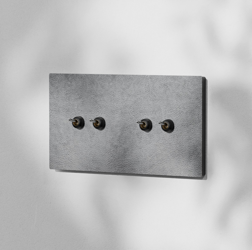 Este modelo presenta una placa con un acabado de efecto cuero que sorprende por su realismo gracias a la superficie suave y mate de aspecto granulado. Su tonalidad neutra aporta la ventaja de adaptarse con facilidad a una amplia variedad de estilos decorativos, destacando por su versatilidad que le permite ir a juego con múltiples paletas de colores. Además, los interruptores cuentan con embellecedores que puedes elegir entre acabado latón o negro texturizado.