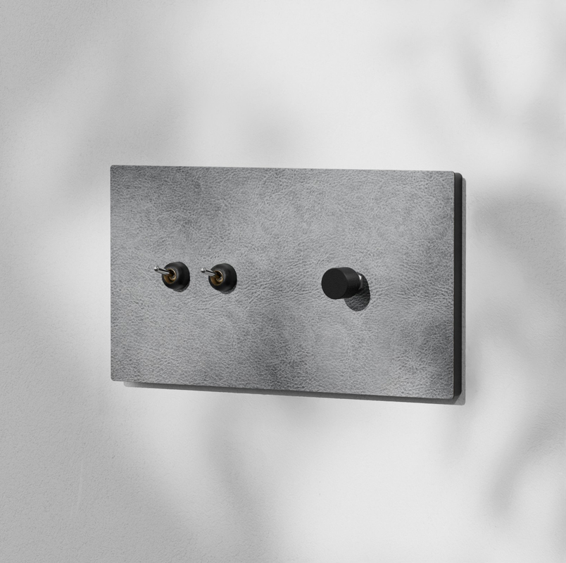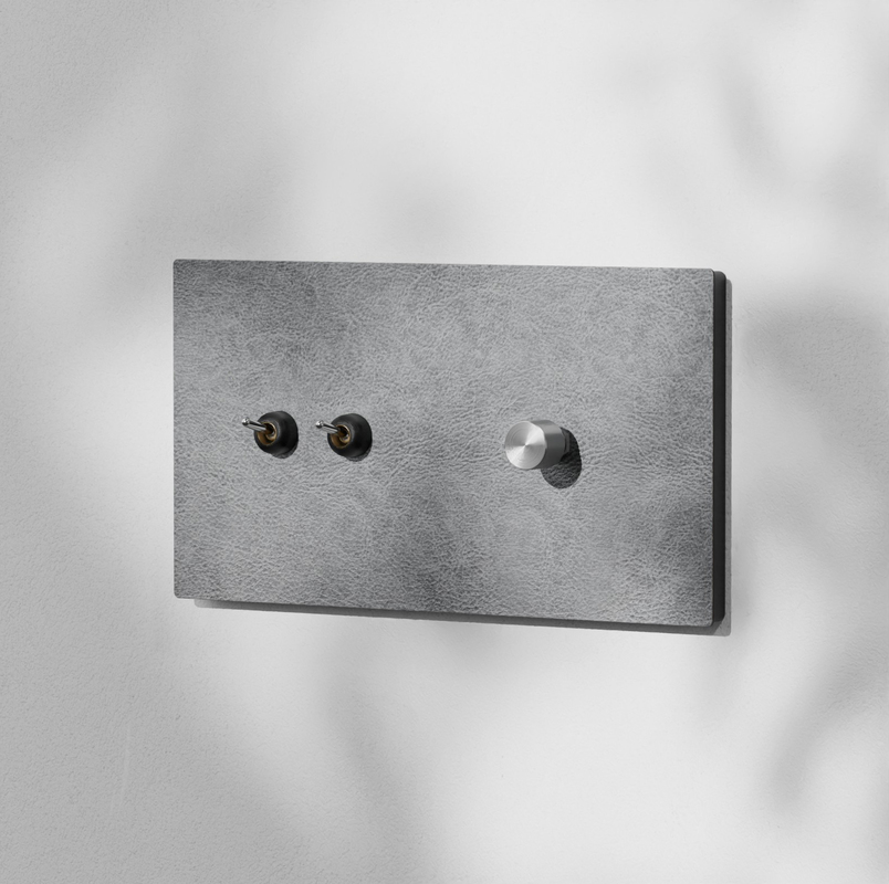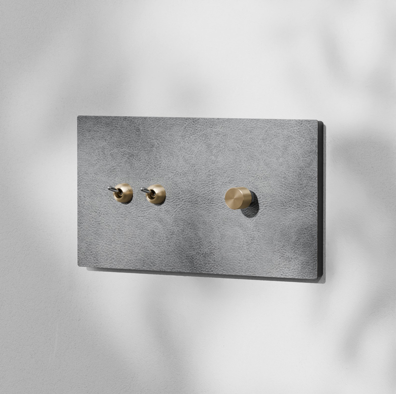Este modelo presenta una placa con un acabado de efecto cuero que sorprende por su realismo gracias a la superficie suave y mate de aspecto granulado. Su tonalidad neutra aporta la ventaja de adaptarse con facilidad a una amplia variedad de estilos decorativos, destacando por su versatilidad que le permite ir a juego con múltiples paletas de colores. Los interruptores y el pulsador cuentan con embellecedores que puedes elegir entre latón, aluminio y acabado en negro texturizado.
