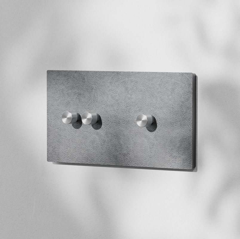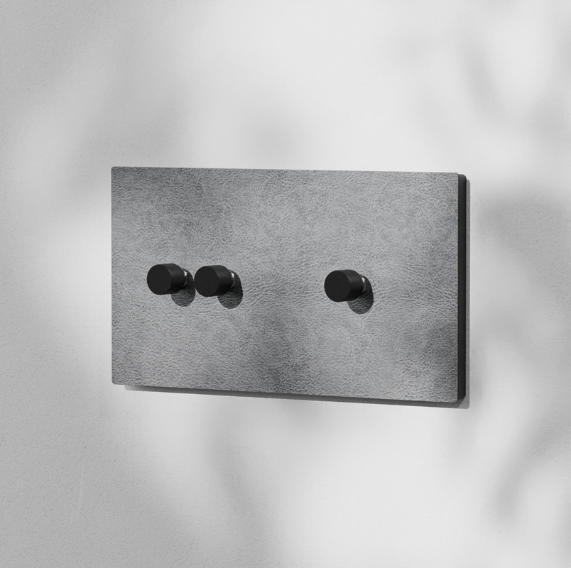 Este modelo presenta una placa con un acabado de efecto cuero que sorprende por su realismo gracias a la superficie suave y mate de aspecto granulado. Su tonalidad neutra aporta la ventaja de adaptarse con facilidad a una amplia variedad de estilos decorativos, destacando por su versatilidad que le permite ir a juego con múltiples paletas de colores. Los pulsadores cuentan con embellecedores que puedes elegir entre aluminio, latón o acabado en negro texturizado.