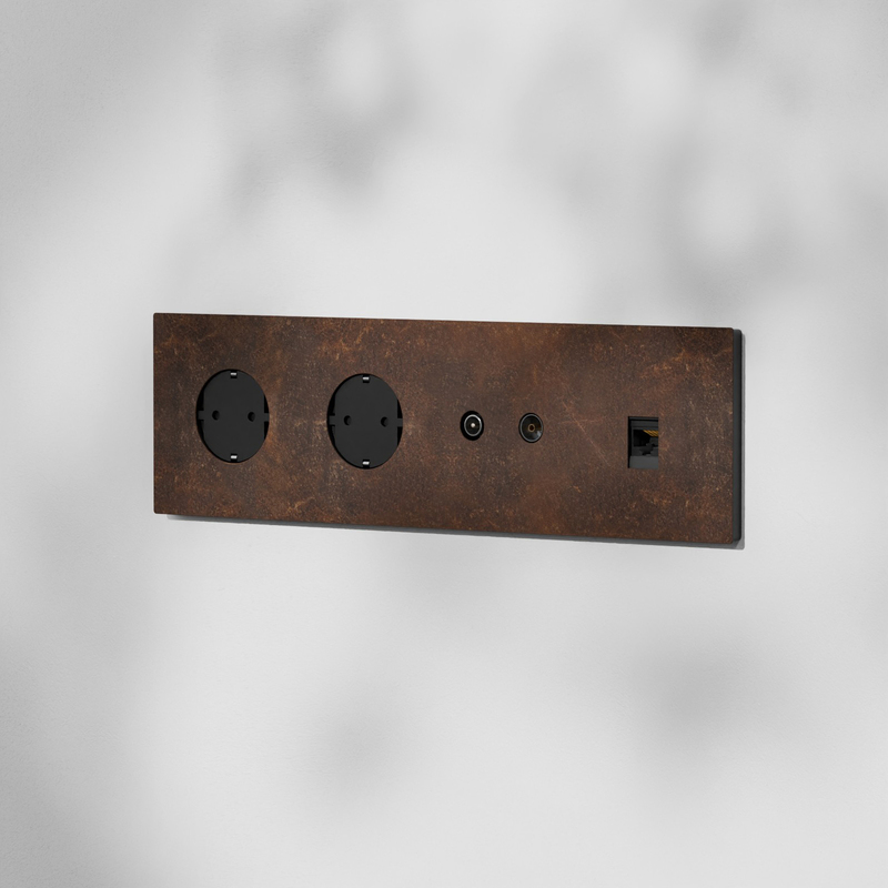 Este modelo presenta una placa con un acabado que imita el acero oxidado al estilo del corten, su superficie suave y mate crea un contraste atractivo en espacios con predominancia de blancos, beiges, tonos claros y desaturados.