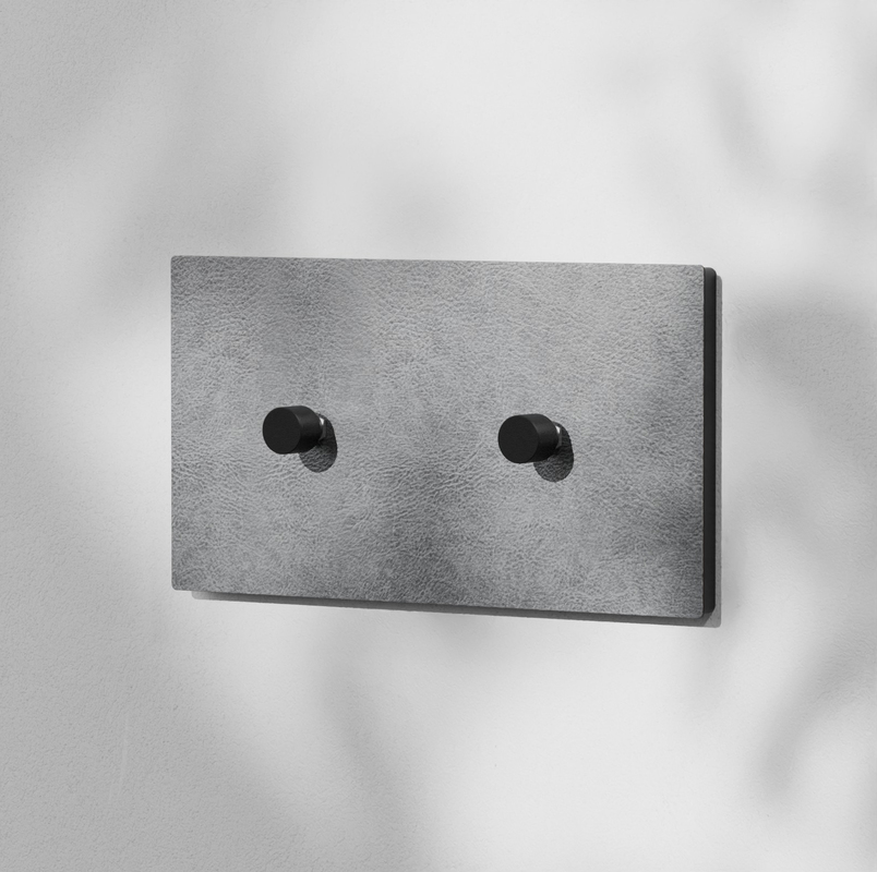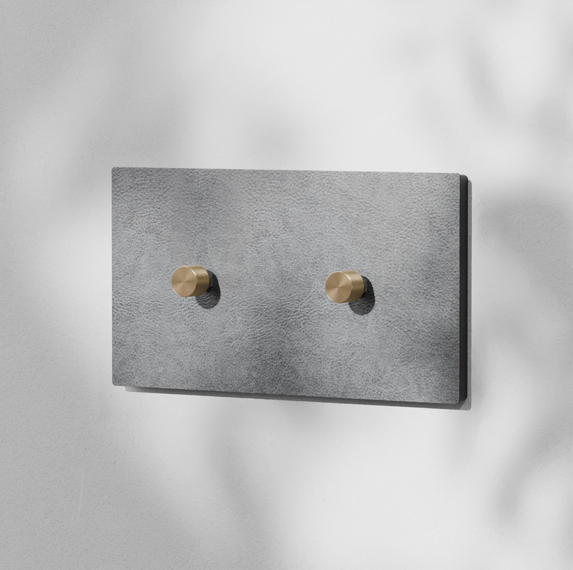 Este modelo presenta una placa con un acabado de efecto cuero que sorprende por su realismo gracias a la superficie suave y mate de aspecto granulado. Su tonalidad neutra aporta la ventaja de adaptarse con facilidad a una amplia variedad de estilos decorativos, destacando por su versatilidad que le permite ir a juego con múltiples paletas de colores. Los pulsadores cuentan con embellecedores que puedes elegir entre aluminio, latón o acabado en negro texturizado.