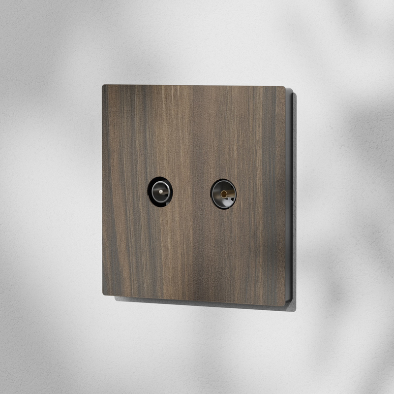 Esta toma de tv presenta una placa con un acabado de efecto realista que simula la madera de nogal, destacándose por su color marrón oscuro con vetas claras. Su superficie suave y mate otorga un acabado lujoso, pero al mismo tiempo transmite una sensación de calidez.